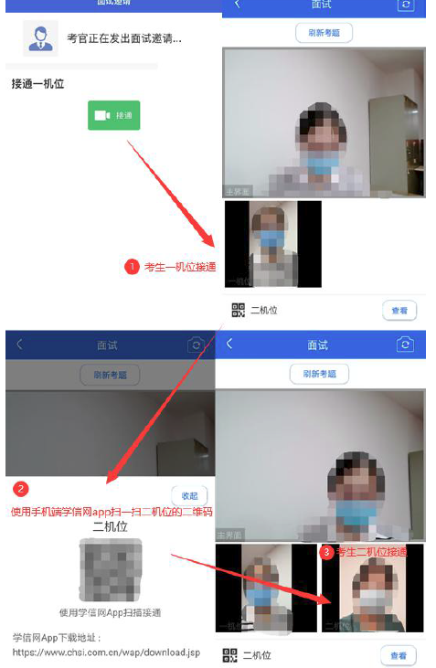 公司要求所有复试考生采用双机位,请考生使用谷歌浏览器,提前登录学信网客户端https://bm.chsi.com.cn/ycms/stu/ ,考生需要用两台设备进行远程面试,可以是电脑+手机、笔记本+手机、手机+手机。(同等学位的考生在复试考试中仍使用单机位,在同等学力加试中使用双机位)