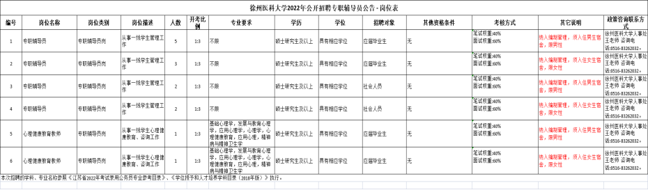 徐州医科大学是省教育厅主管的全额拨款事业单位,位于江苏省徐州市云龙区铜山路209号。为更好地选拔优秀适岗人才,充实人才队伍,优化团队结构,徐州医科大学现面向社会公开招聘优秀专职辅导员。根据《江苏省事业单位公开招聘人员办法》等规定,现将有关事项公告如下: